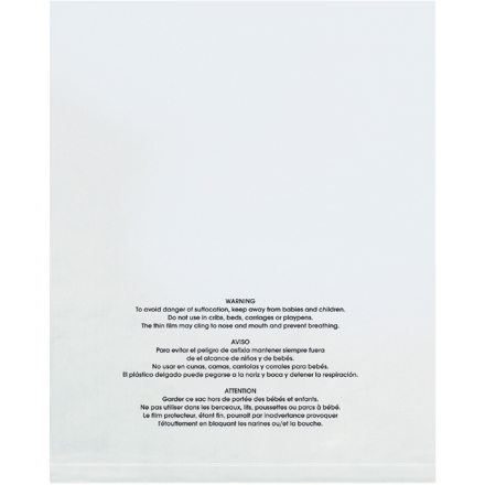 Bag is printed: WARNING: To avoid danger of suffocation, keep away from babies and children. Do not use in cribs, beds, carriages or playpens. The thin film may cling to nose and mouth and prevent breathing.